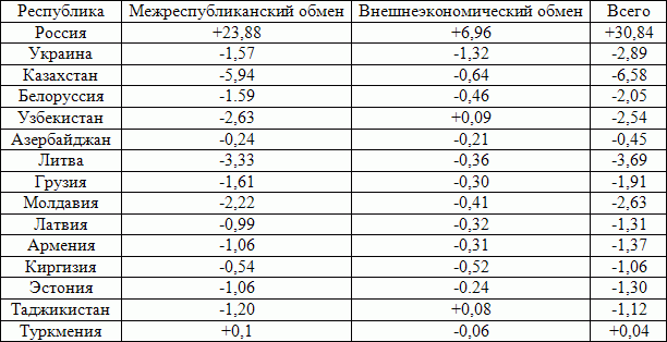 Разумеется, делать из этого факта вывод, что Россия и Туркменистан были единственными донорами в Советском Союзе по отношению к другим республикам, что именно для них роспуск СССР, переход к торговле по мировым ценам улучшит экономическое положение, было некорректно. Однако обсуждение этой темы было эффективным инструментом в руках тех, кто эксплуатировал тему ущемленного положения русских в СССР.