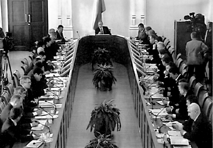 Председатель Правительства России В. В. Путин проводит в апреле 2010 года совещание в городе Мурманске по развитию рыбной отрасли, в ходе которого представитель Северного бассейна В. Зиланов (крайний справа) докладывает о проблемах рыболовства в районе архипелага Шпицбергена