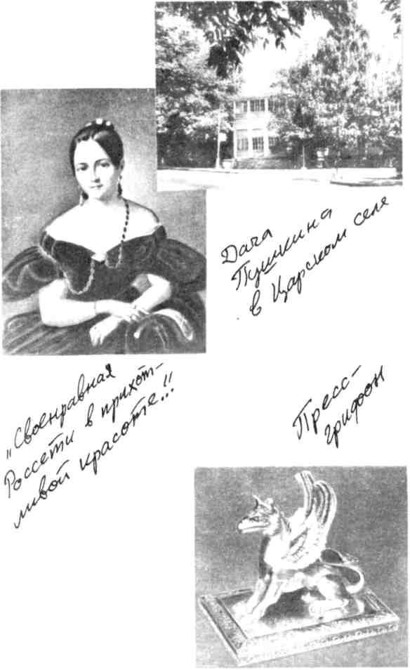 «Своенравная Россети в прихотливой красоте все сердца пленила эти, те, те, те и те, те, те…» — вспомнил я веселый экспромт о фрейлине императрицы Александре Осиповне Россет, жившей в Ц. С. в то же время, что и Пушкин. Женщине изящной, красивой, литературно образованной, дружбой с которой очень дорожил Пушкин. Экспромт он написал мелком на зеленом сукне. Кстати, свидетелем этой записи был Н. Д. Киселев.