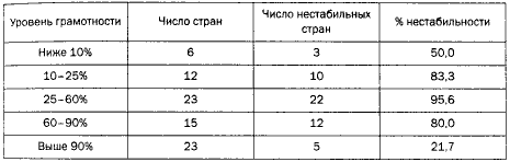 В пользу отсутствия выраженной прямой корреляции между бедностью и нестабильностью свидетельствуют и другие данные. Хотя корреляция между ВНП на душу населения и смертностью от внутреннего группового насилия составила -0,43 (п = 74), наибольшее количество насилия наблюдалось не в беднейших странах с душевым ВНП меньшим 100 долларов, а в несколько более богатых с душевым ВНП от 100 до 200 долларов. При значении показателя выше 200 долларов размеры насилия существенно снижаются. Эти данные привели к выводу, что «в слаборазвитых странах следует ожидать довольно высокого уровня внутренней нестабильности в течение некоторого времени и в очень бедных странах вероятен рост, а не снижение внутреннего насилия в следующие несколько десятилетий»49. Аналогичным образом Экстейн обнаружил, что 27 стран, в которых внутренние насильственные конфликты были редкостью в период 1946–1959 гг., распадаются на две группы. Девять из них принадлежали к числу наиболее современных (такие, как Австралия, Дания, Швеция), тогда как 18 других — это «сравнительно слаборазвитые страны, в которых элиты оставались тесно связаны с традиционными типами и структурами жизни». В их числе оказалось несколько все еще отсталых европейских колоний, а также такие страны, как Эфиопия, Эритрея и Саудовская Аравия50. Близок к этому и результат, согласно которому зависимость нестабильности от распределения стран по уровню грамотности описывается колоколообразной кривой. Нестабильными оказались 95% стран в среднем диапазоне 25-60-процентной грамотности в сравнении с 50% стран с грамотностью меньше 10% и 22% стран с более чем 90% грамотности. В другом исследовании средние показатели нестабильности были подсчитаны для 24 современных стран (268), 37 стран переходного типа (472) и 23 традиционных стран (420)51.