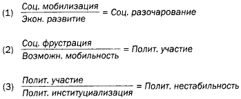 В этих условиях участие в политике становится для социально мобилизованного индивида средством продвижения. Социальные фрустрации побуждают предъявлять более высокие требования к власти и к расширению своего участия в политике, что, в свою очередь, усиливает требовательность к власти. В то же время отсталость страны в сфере политической институциализации делает трудным, если не невозможным, чтобы требования к власти выражались в законных формах и могли умеряться и встраиваться в политическую систему. В итоге резкий рост политической активности порождает политическую нестабильность. Влияние модернизации, таким образом, предполагает следующие зависимости: