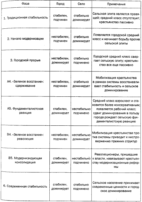 Нестабильность города — обстановка переворотов, беспорядков и демонстраций — представляет собой в какой-то мере неизбежную характеристику модернизации. Степень, в которой проявляется эта нестабильность, зависит от эффективности и легитимности политических институтов общества. Городская нестабильность поэтому не слишком значительна, но универсальна. Сельская нестабильность, напротив, принимает значительные масштабы, но ее можно избежать. Если городским элитам, идентифицирующимся с политической системой, не удается взять контроль над «зеленым восстанием», появляется возможность захвата власти оппозиционной группой — революционным путем при поддержке крестьянства — и создания новой институциональной однопартийной структуры для устранения разрыва между селом и городом. Если же городским элитам, идентифицирующим себя с политической системой, удается вовлечь крестьян в политику на своей стороне, то у них появляется возможность поставить барьеры на пути распространения нестабильности и сдержать ее. Поддержка, оказываемая режиму со стороны сельских районов, позволяет ему выдержать враждебность города на ранних этапах модернизации. Цена, которую режиму приходится заплатить за эту сельскую поддержку, состоит в модификации или отказе от многих усвоенных им западных или современных ценностей и практик. Так, парадоксальным образом, «зеленое восстание» оказывает на политическую систему либо в высокой степени традиционализирующее, либо глубоко революционное влияние.