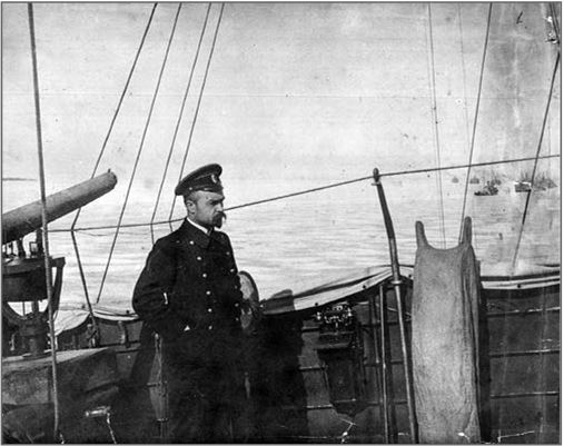 А. М. Щастный на мостике флагманского корабля «Кречет» во время Ледового похода. 16 апреля 1918 г.