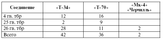 В результате дневного боя корпусом уничтожено: танков – 5, пушек – 3, минометов – 1, самолетов – 3, автомашин – 10, ручных пулеметов – 3, станковых пулеметов – 1, дзотов – 2, солдат и офицеров – 120, при этом понесли потери в личном составе: убито – 7 чел., ранено – 20 чел.; танков сожжено: «Т-34» – 1, подбито: «Т-34» – 3, «Т-70» – 1, ПТО – 2, автомашин – 3…»[565]