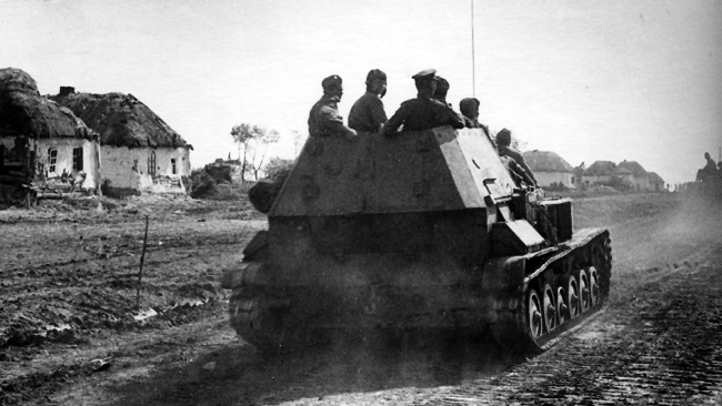 СУ-76 одного из корпусов 5 гв. ТА проходит по освобожденному х. Тетеревино. Прохоровское направление. Вторая половина июля 1943 г. (РГАКФД)