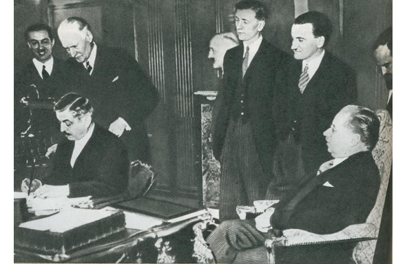 Подписание советско-французского договора о взаимопомощи в Париже. Слева сидит П. Лаваль (глава МИД Франции), справа В. Потемкин (посол СССР во Франции).
