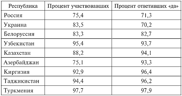 – Прибалтика, Грузия, Армения и Молдавия голосовать отказались. В остальных же республиках результат был таким: пришло 80 процентов из внесенных в списки, из них 76 процентов поддержали сохранение Союза. А если смотреть по отдельным республикам, то вот что любопытно: в РСФСР голосовал меньший процент и меньше было ответов «да». Таблицу включите, пожалуйста!