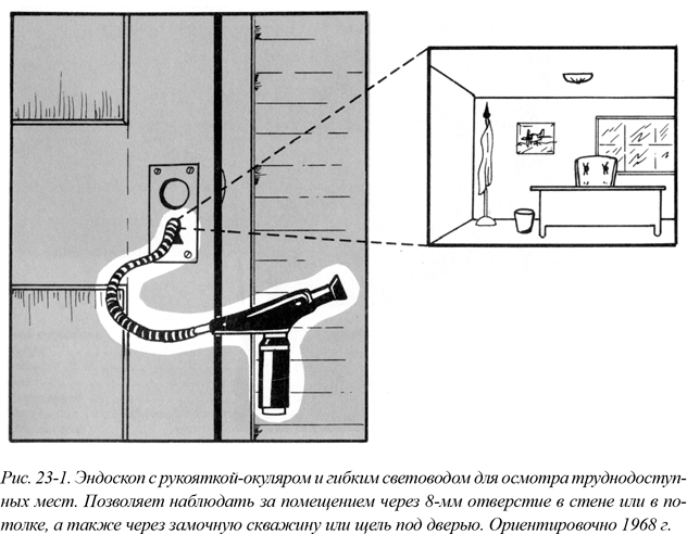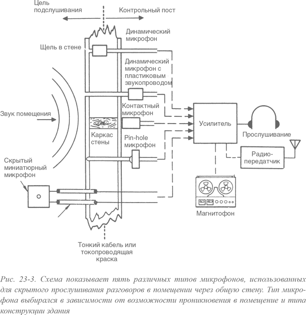 Оба мероприятия – установка техники акустического контроля и скрытой видеокамеры – состоят из трех основных компонентов: устройства съема информации, канала ее передачи и контрольного поста. Устройства съема – это микрофоны или видеокамеры, которые будут тайно собирать информацию для передачи далее по кабелю или по радиоканалу для прослушивания или просмотра. Миниатюрные микрофоны часто встроены в изделия из дерева, телефонные закладки устанавливаются около кабелей связи, а видеокамеры скрываются, например, за зеркалом гардеробной комнаты. Питание для устройств съема информации подается от батарей или от имеющихся на объекте электросетей.