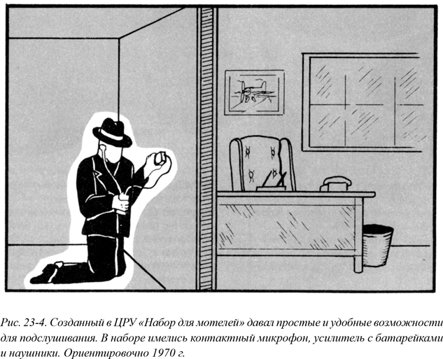 Оливка с «жучком» в бокале с мартини прекрасно вписывается в сюжет кинофильма, но такие вещи, как правило, далеки от реальных операций ЦРУ. Чтобы получить важную информацию, техники OTS устанавливали системы подслушивания в стены и потолки консульств и посольств, прятали магнитофоны в атташе-кейсах и внедряли микрофоны с передатчиками в жилые квартиры. Техники использовали контактные микрофоны для прослушивания гостиничных номеров через смежные стены, проводили манипуляции с телефонами, перехватывали звонки сотовых телефонов и фиксировали отражение лазерных лучей от оконных стекол. Даже когда офицер OTS маскировал микрофон в бюстгальтере другого оперативного офицера, он преследовал одну лишь цель – обеспечение национальной безопасности.