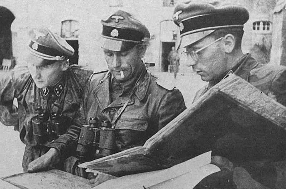 Офицеры дивизии Эрик Урбаниц, Карл-Хайнц Принц и Карл Бартлинг обсуждают план боевых действий