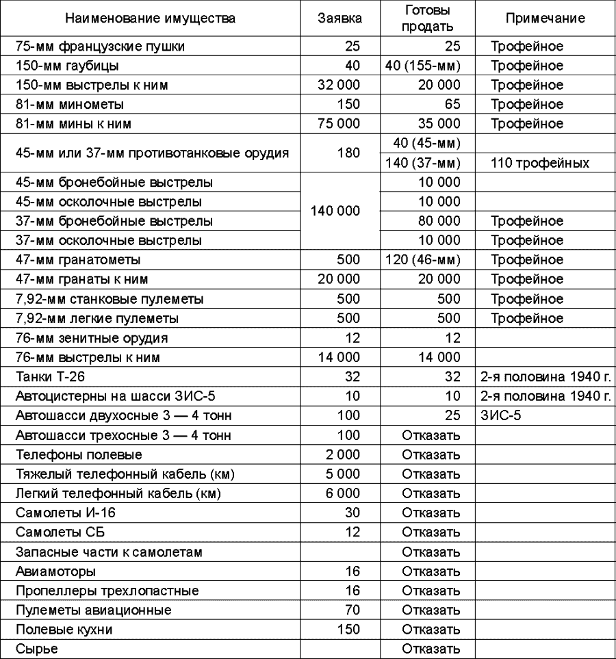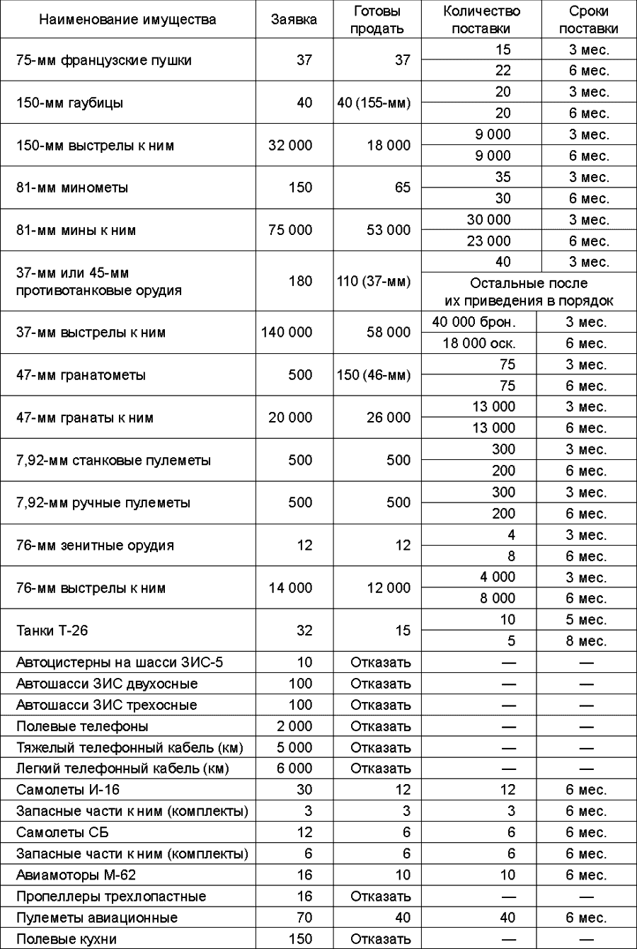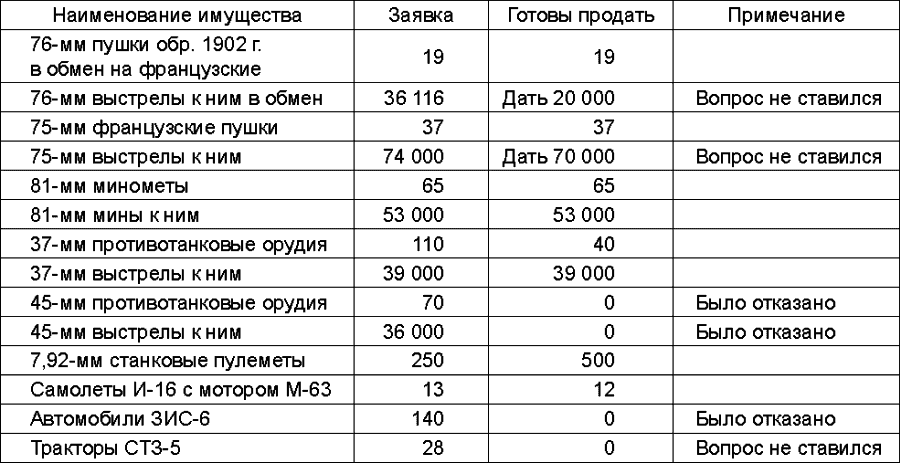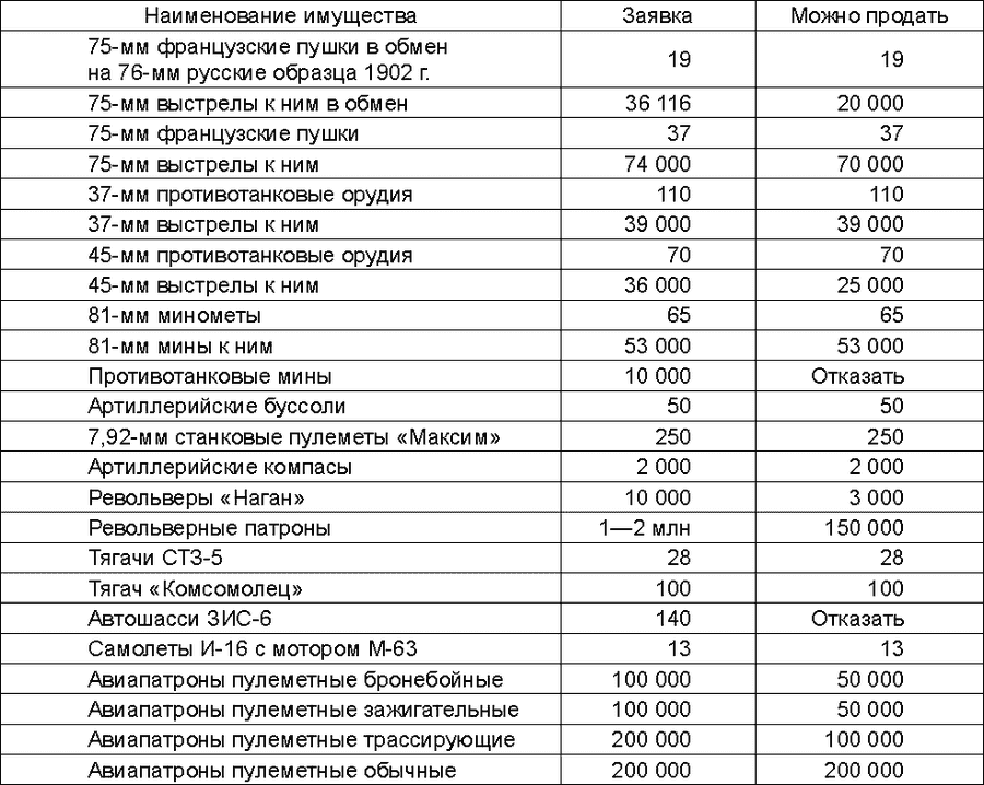 4 мая заместитель начальника Артиллерийского управления РККА дивинженер М.М. Каюков направил заместителю наркома обороны командарму 2-го ранга А.Д. Локтионову докладную записку № 370150с, которой сообщал, что артиллерийское имущество может быть отгружено по литовской заявке (см. таблицу 38) в течение трех месяцев с момента принятия решения о продаже[878].
