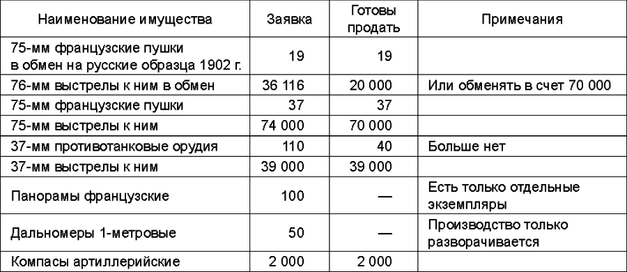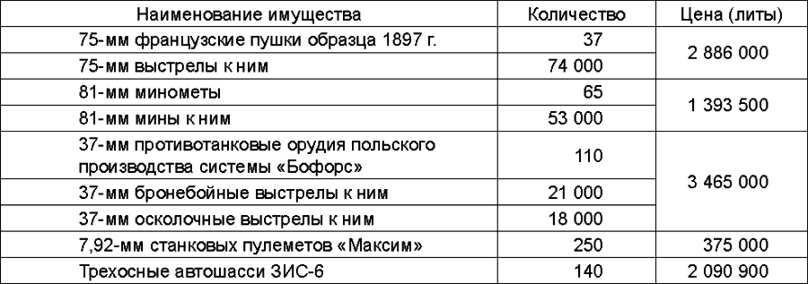 Как бы то ни было, 10 февраля в НКО был подготовлен перечень предметов, намеченных к продаже Литве, копия которого была 11 февраля передана начальнику Инженерного отдела НКВТ В.Г. Маштакову (см. таблицу 35). Кроме того, предусматривалось обменять 19 русских 76-мм пушек образца 1902 г. со снарядами на соответствующее количество 75-мм французских пушек образца 1897 г. со снарядами через 3 месяца после заключения договора.