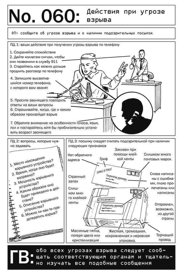 Большинство сообщений о заложенном взрывном устройстве, поступающих в организации, которые занимаются бизнесом, и в школы, оказываются вымышленными, и их цель — заставить компании понести расходы или вызвать панику и хаос. Тем не менее любые такие угрозы следует воспринимать всерьез и немедленно после их получения совершать ряд обязательных действий.