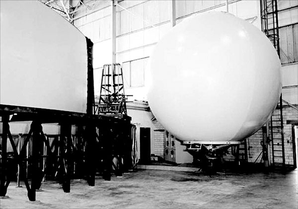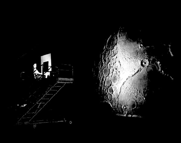 На фото вы видите павильон для съемок «облета Луны по окололунной орбите»: чистый шар диаметром 6 метров, который приводился во вращение двигателем, установленным под ним, огромное, тоже пока еще чистое панно. Это – декорация в начале работы коллектива НАСА по преобразованию шара в полную кратеров, достоверно смотрящуюся Луну. Рядом с панно проложены рельсы (всего было 3 панно). По этим рельсам двигалась вагонетка, а на вагонетке была установлена кинокамера.