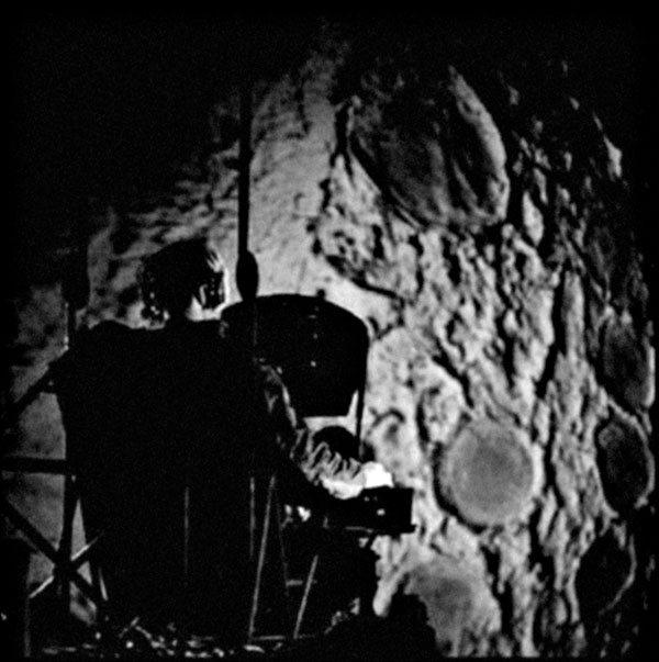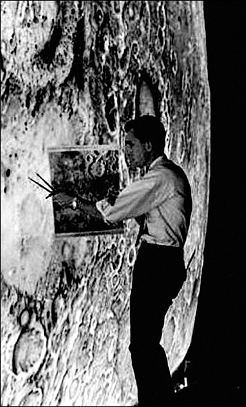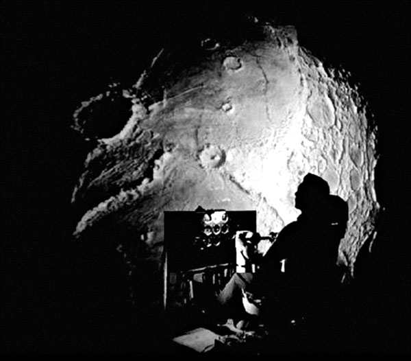 Сначала на пленку снимали вращающийся шар «полет к Луне», камера катилась вокруг шара (рис. 146–148), затем снимали имитацию лунной поверхности на готовом панно, что подразумевало полет по «лунной орбите» (рис. 149).