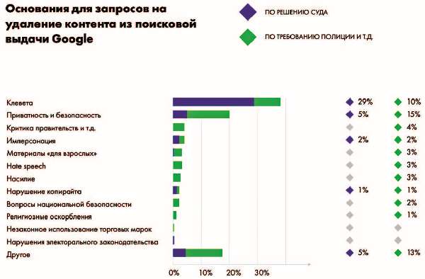 Во-вторых, Google получает запросы от государственных органов и судов на удаление материалов из поисковой выдачи. Как правило, основания для этого следующие: клевета / диффамация и нарушение законов конкретного государства (к примеру, запрещающих hate speech или контент «только для взрослых»).