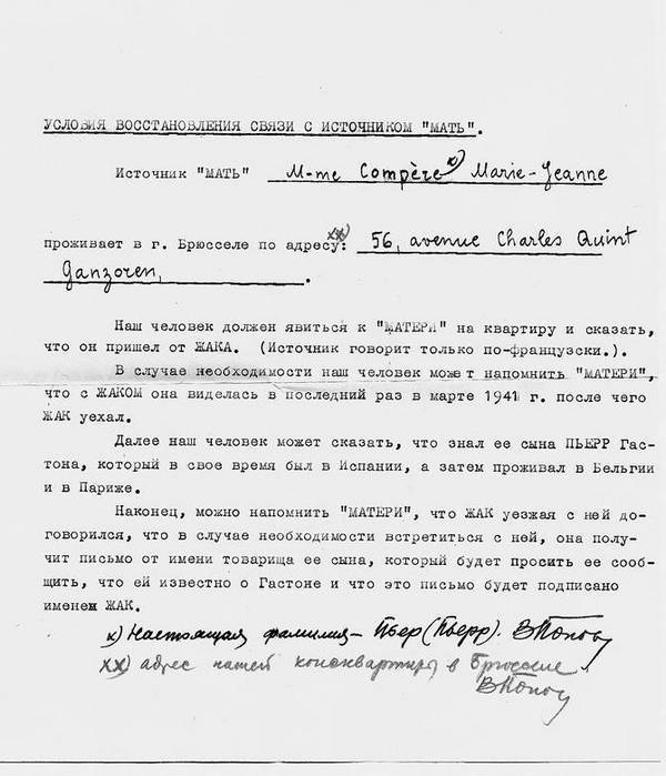 Во-первых, в материалах СВР обнаруживаем бумагу, где Круйту предписывается в Брюсселе явиться к «МАТЕРИ», которая «говорит только по-французски» и которой был «сын, который в свое время была в Испании». Это совпадает с тем, что мы уже знаем о Мари Пьер.