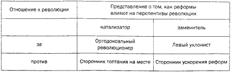 Отношение между реформой и революцией имеет ключевое значение для всех групп, затронутых процессом политических изменений. Сторонник решительных реформ убежден, что реформа есть заменитель революции, и именно по этой причине пытается достичь большего социального и экономического равенства мирными средствами. Крайний радикал, или «левый уклонист», также обычно принимает теорию альтернативы и на этом основании выступает против реформ. «Ортодоксальный революционер» и сторонник «топтания на месте», напротив, принимают теорию катализатора, которая побуждает последнего выступать против всякого изменения статус-кво, тогда как первый надеется использовать малые перемены в роли клина для подготовки к осуществлению более фундаментальных изменений.