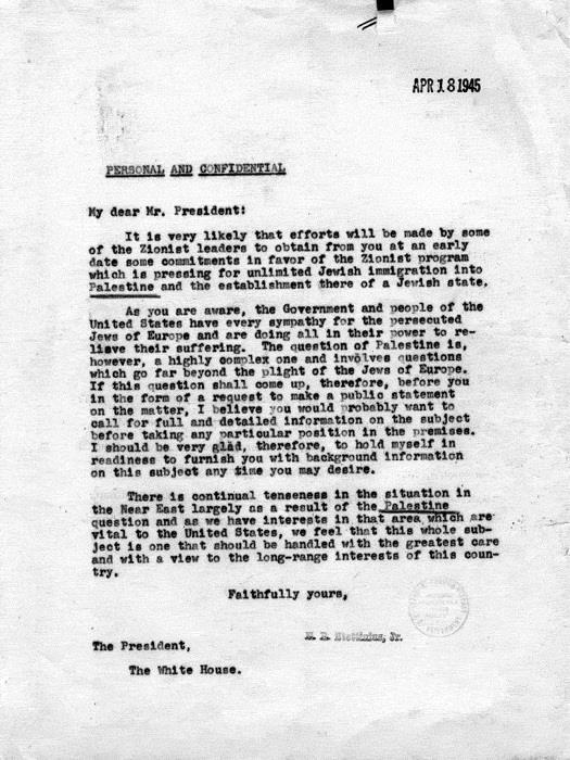 Прошло только шесть дней, как Трумэн занял президентский пост, и палестинский вопрос попал в официальную повестку дня Белого дома. Представители руководства еврейской американской общины, в частности раввин Уайз, начали активно добиваться встречи с президентом, и госсекретарь Эдвард Стеттиниус, опытный политик, бывший сподвижник Рузвельта, по этому поводу даже направил Трумэну памятку. В ней он предупреждал, что сионистские лидеры, очевидно, будут добиваться поддержки в вопросе о неограниченной иммиграции в Палестину и о создании еврейского государства. Госсекретарь предлагал, ввиду «особой сложности палестинского вопроса», получить полную подробную информацию по этой проблеме до того, как президент займет определенную позицию. «У Соединенных Штатов есть жизненно важные интересы в регионе, – писал Стеттиниус, – и мы считаем, что эта проблема из тех, к решению которых нужно подходить с особенной осторожностью»[19] (см. фото).