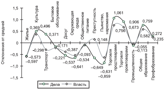 Рис. 8.14. График отклонений от средней общей оценок состояния дел в разных сферах жизни и решения этих дел местной властью в Касимове в 1994 г. (n = 845 опрошенных)