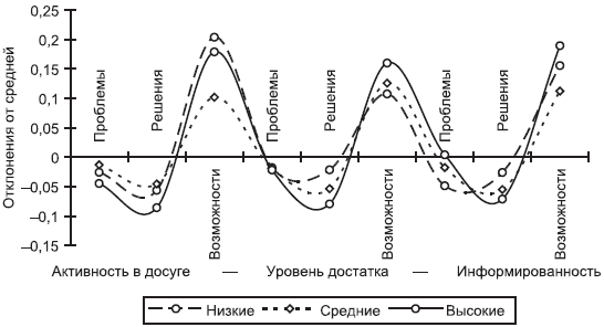 Рис. 8.15. График отклонений от средней общей интегральных оценок состояния дел в городе в целом, решения этих дел местной властью в целом и возможностей по девяти инфраструктурным параметрам жизни также в целом в Касимове в 1994 г. в зависимости от активности в досуге, уровня благосостояния и общественно-политической информированности. (n = 845 опрошенных)