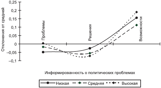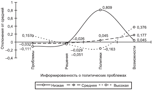 Рис. 8.16. График отклонений от средней общей интегральных оценок состояния дел в городе в целом, решения этих проблем местной властью в целом и возможностей по девяти инфраструктурным параметрам жизни также в целом в Касимове в 1994 г. в зависимости от общественно-политической информированности (n = 845 опрошенных)