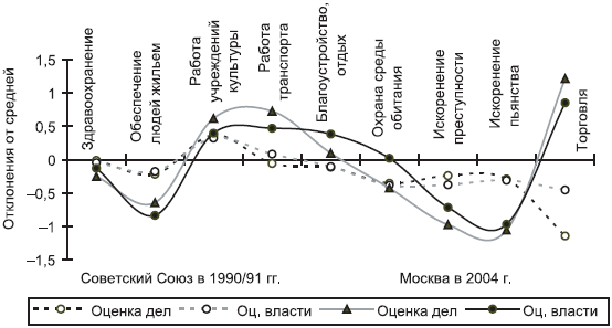 Рис. 8.18. Сравнительная картина отклонений оценок различных параметров от интегральной средней в СССР 1990/91 г. и Москве 2004 г. [поданным Всесоюзного (n = 9674) и пилотажного московского (n = 131) исследований; Всесоюзный массив перевзвешен по переписи 1989 г.)