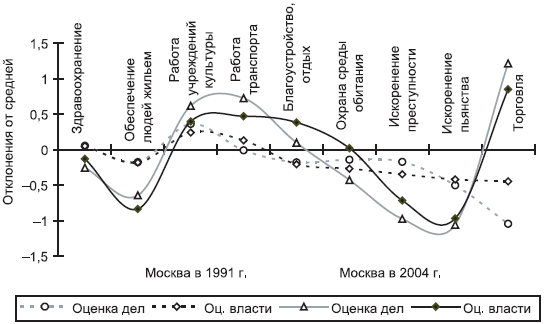 На графике рис. 8.14 видны принципиальные изменения отклонений оценок населением различных сфер жизни и усилий власти. За изменением инфраструктуры активности последовало изменение смысловых полей оценок состояния дел и власти. Теперь торговля пром– и продтоварами дает положительные отклонения оценок общественного мнения, хотя отклонение оценок усилий власти в этой области несколько ниже, что естественно. Местная власть «организует» торговлю в соответствии с общефедеральным законодательством. И население фиксирует относительность ее заслуг в этой области. Высоки оценки состояния дел в сфере учреждений культуры и транспорта, общего и (несколько ниже) профобразования. Но резко ниже нулевой отметки падают отклонения состояния дел по жилищной проблеме, бытовому и коммунальному обслуживанию, досугу, состоянию окружающей среды, преступности, алкоголизму и наркомании. Власть получает плюсовые отклонения в общественном мнении за борьбу с преступностью, но резко позиционируется ниже нуля (-0,298) в организации работы транспорта, хотя последняя отмечается отклонением оценок в положительную сторону. Здесь есть, вероятно, сугубо местные особенности, которые надо было проявлять на месте. В остальном же волна отклонений оценок усилий местной власти «скользит» соответственно отклонениям оценок населением состояния дел в той или иной области. Итак, изменилась предметная структура деятельность и вслед за ней меняется структура оценок.