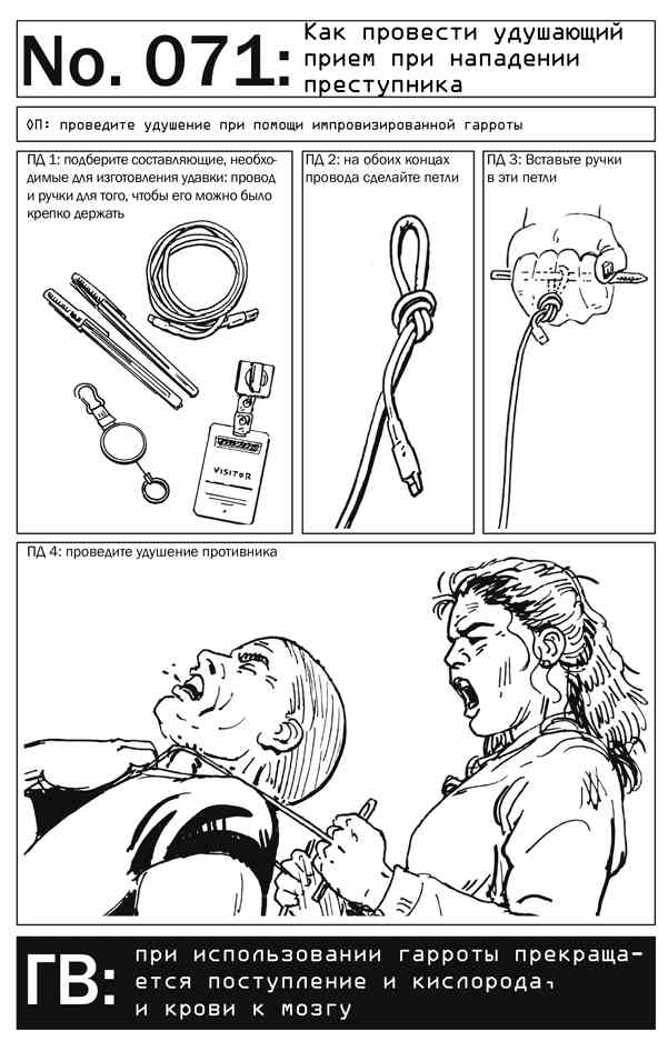 Накиньте провод сзади через голову преступника ему на горло, а затем потяните руками за концы, чтобы петля плотно обхватила его. Постарайтесь как можно сильнее затянуть ее. Удерживайте петлю на горле до тех пор, пока противник не перестанет двигаться. Сознание вернется к нему примерно через минуту, поэтому воспользуйтесь этим временем, чтобы убежать в безопасное место.