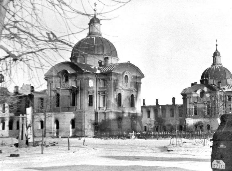 Немецкое военное кладбище на площади Революции, известное как «кладбище у церкви». Интересно, что звезды на шпилях Путевого дворца остались нетронутыми.