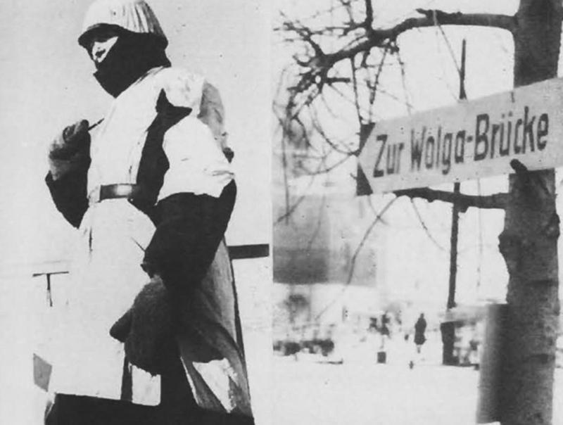 Часовой 1-й танковой дивизии вермахта у указателя на Волжский мост. Маскхалат сделан из белой ткани, найденной на складах текстильной фабрики.