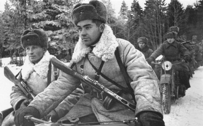 Мотоциклисты разведывательного подразделения 252-й стрелковой дивизии, ноябрь 1941 года.