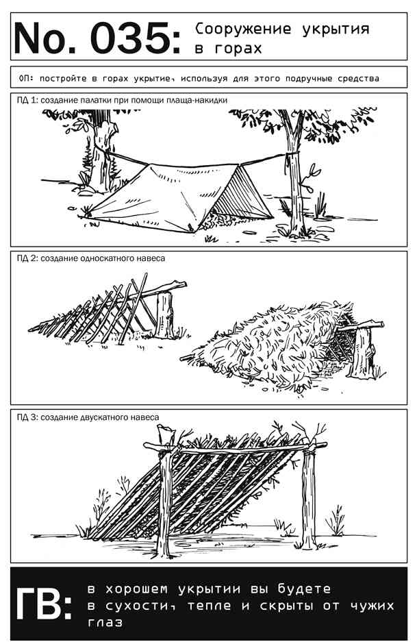 Если вы путешествуете с хорошими инструментами (см. раздел 031), то сможете сделать изолированное укрытие из веток и листвы. Вместо стволов деревьев или пней можно воспользоваться также лыжными палками, походными палками и ледорубами для создания укрытия с навесом из плаща-накидки.