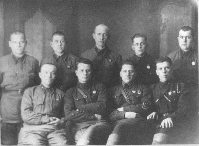 Командиры и бойцы 156 полка НКВД.Сидят слева направо с-нт Тришкин Василий Сергеевич – истребитель танков, военком полка бат. комис. Старостин С.М., ком полка майор Зубков С.Ф., ком бат капитан Макаров Григорий Григорьевич. Стоят справа налево Ком. отд. мл. с-нт Михаил Петрович Севастьянов, кр-ц М.Карпуков – истребитель танков, (пом. ком. взв. ст. с-нт Дмитрий Филиппович Киян истребитель танков), кр-ц Сергей Гаврилович Шахов и кр-ц Павел Дмитриевич Андреев – истребители танков.