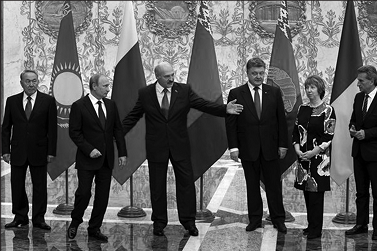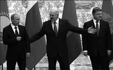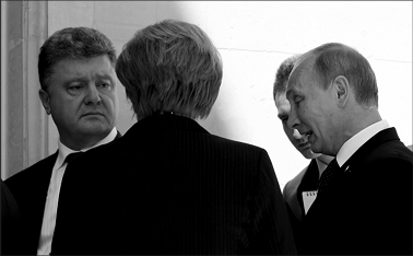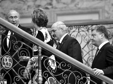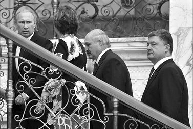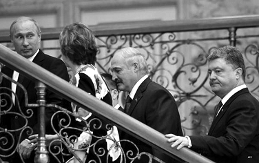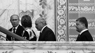 Обратите внимание на лица президентов Лукашенко и Порошенко — они неизменны в своём эмоциональном наполнении. Александр Лукашенко сосредоточен и серьёзен, а Пётр Порошенко... откровенно говоря, испытывает дискомфорт от присутствия Путина.