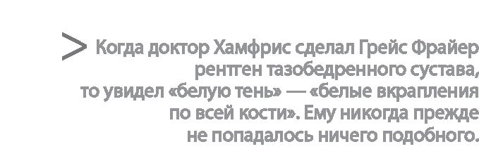 На рентгеновском снимке Хамфрис увидел «белую тень», как он ее назвал. Она была специфической, демонстрируя «белые вкрапления по всей кости». Ему никогда прежде не попадалось ничего подобного. Как позже писал Джон Роач об этих сбивающих с толку болезнях: «Вся эта ситуация приводит в замешательство… эта странная и разрушительная [сила] совершенно неизвестна медицине и хирургии».