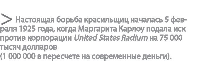 Наперекор всему Маргарита Карлоу нашла адвоката, который согласился взяться за ее дело. Пятого февраля 1925 года она подала иск против корпорации United States Radium на 75 000 тысяч долларов (1 000 000 в пересчете на современные деньги).
