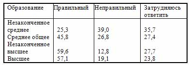 Распределение ответов на вопрос «Как Вы думаете, переход к свободной рыночной экономике — это правильный или неправильный шаг для будущего России?» в зависимости от образования респондентов, в % по строке: