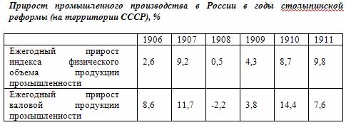Таким образом, в отношении главной отрасли тогдашней российской экономики А.Н.Яковлев сказал заведомую неправду. Однако и в отношении промышленного производства утверждение А.Н.Яковлева является ложью. Общий прирост физического объема продукции промышленности на территории СССР за 1906-1911 гг. составил 40,2%, а за период 1906-1910 гг. (когда Столыпин обладал реальной властью как премьер-министр) только 27,7%. О двукратном увеличении и речи не было, 1906-1909 гг. в России считались годами «промышленной депрессии». Даже с учетом быстрого развития Польши и Финляндии общий прирост валовой продукции промышленности в пределах всей Российской империи за 1906-1911 гг. составил 54%. Вот точные данные по годам283: