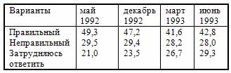 Что же касается массового сознания, то оно вследствие этого обмана было дезориентировано и расщеплено. С мая 1992 г. по июнь 1993 г. в 12 регионах РФ Институтом социологии РАН было проведено исследование на представительной выборке. Реформаторы трактуют результаты как поддержку населением «перехода к рынку». Но даже сама эта трактовка является обманом (помимо обмана, таящегося в понятии «переход к рынку). Вот главная таблица: