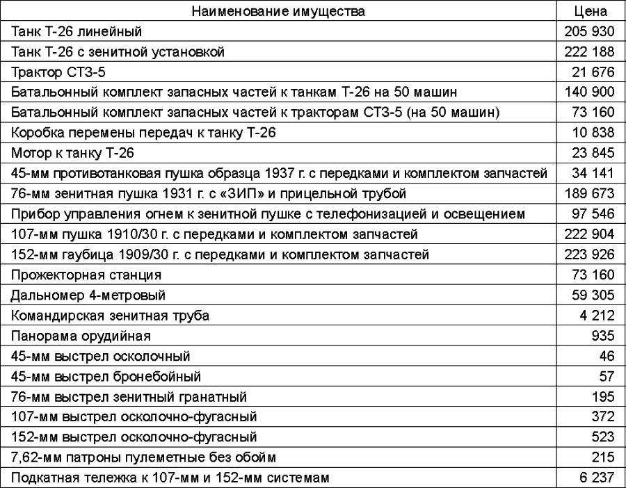 Как бы то ни было, 28 декабря 1939 г. заместитель наркома внешней торговли М.С. Степанов передал заместителю наркома обороны командарму 2-го ранга А.Д. Локтионову ведомости с ориентировочными ценами на продажу имущества для латвийской армии (см. таблицу 24), в основном превосходившими те, по которым советское вооружение поставлялось в Испанию и Китай. При этом предусматривалась скидка на 5 % по каждому виду военного имущества[823].