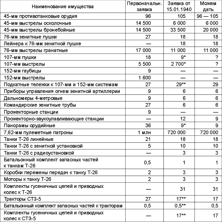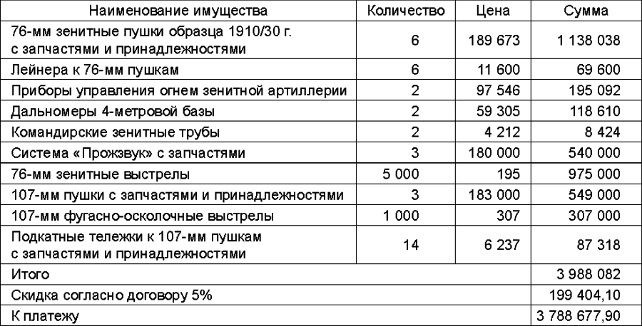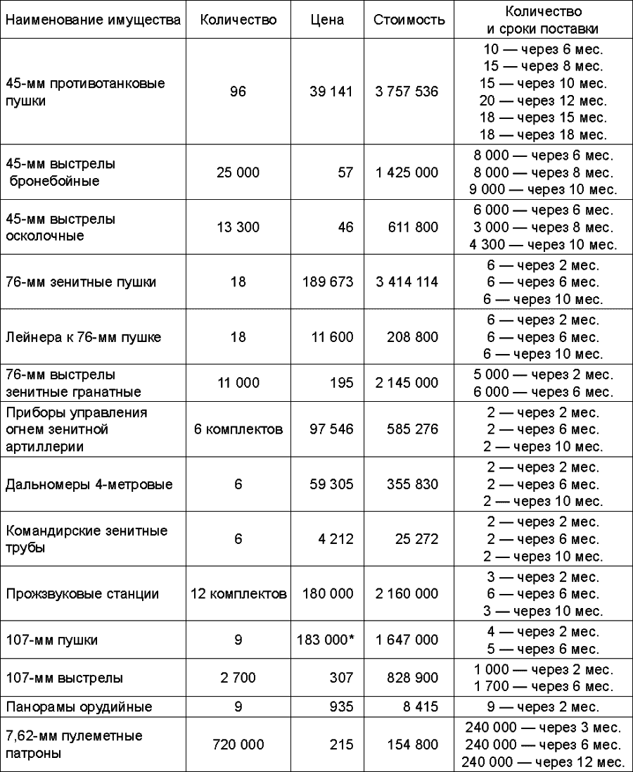 * – цена на 107-мм пушки указана за новые, но поставляться будут пушки, уже бывшие в эксплуатации. При приемке паритетная комиссия определит процент амортизации, и цена будет соответственно снижена.
