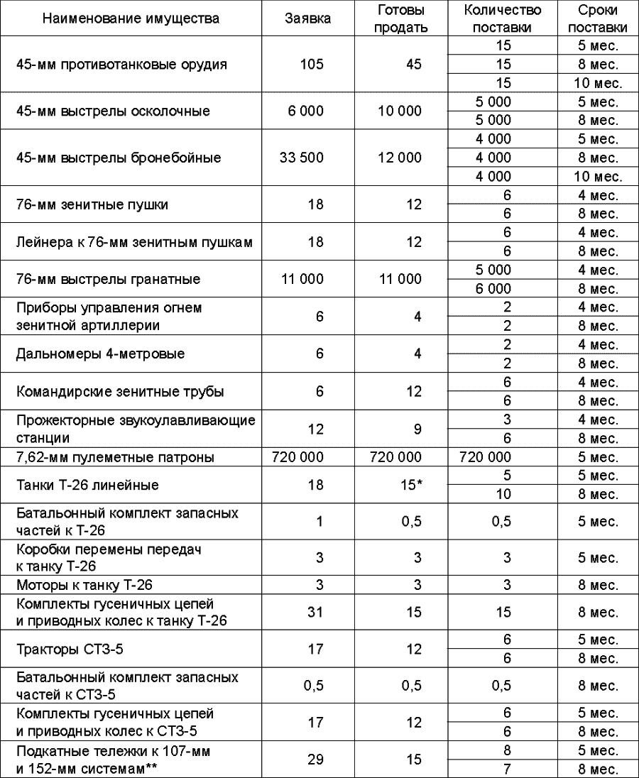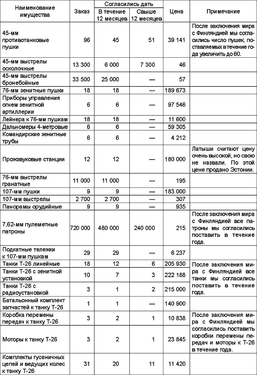4. Сроки поставки, указанные в прилагаемой ведомости, латышам не сообщены. Латышам лишь сообщено, что будем поставлять вооружение в течение 1940 года.