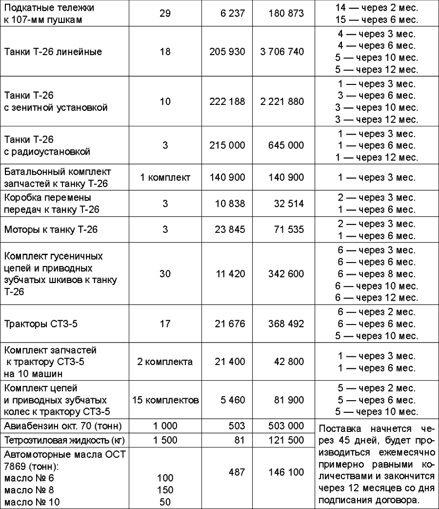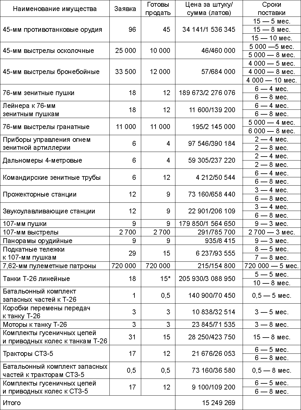 В итоге 23 марта В.Г. Маштаков и В.И. Рябченко от имени Инженерного отдела НКВТ СССР, а полковник А. Далбергс от имени Военного министерства Латвии подписали договор на поставку артиллерийского и автобронетанкового имущества общей стоимостью 25 933 577 латвийских латов, включая стоимость годной для железнодорожных перевозок упаковки, а также стоимость перевозки грузов до границы. Советская сторона делала скидку в 5 % на вооружение, но не делала скидку на поставляемые нефтепродукты. Кроме того, латвийская сторона возмещала советской стороне затраты на транспортировку грузов от ст. Бигосово до пункта назначения на территории Латвии. В течение года со дня поставки советская сторона должна была в течение 2 месяцев бесплатно исправлять или обменивать дефектные предметы или отдельные части предметов, но латвийская сторона должна была доказать, что дефекты не возникли по ее вине. Материальная часть артиллерии и бронетанкового имущества сдавалась представителями сторон на ст. Бигосово в собранном виде, а упакованные в ящики запчасти, боеприпасы и приборы управления огнем проверялись на складах в Латвии. Забракованные при приемке предметы заменялись на новые в течение 20 дней. На все поставляемое имущество советская сторона передавала также составленные на русском языке руководства службы, необходимые при эксплуатации и уходе за ним, формуляры и таблицы стрельбы для материальной части артиллерии. Нефтепродукты на советско-латвийской границе передавались латвийской железнодорожной администрации на основании соответствующих документов советской стороны. Платежи за поставки должны были производиться наличными в латвийских латах в течение 14 дней после переотправки через советско-латвийскую границу принятого латвийской стороной имущества. Правда, эти средства советская сторона могла «использовать только в Латвии на возмещение расходов по возведению и ремонту зданий и других сооружений для нужд размещенных на территории Латвии гарнизонов СССР, а также на уплату расходов по содержанию этих гарнизонов». Могущие возникнуть споры должны были разрешаться смешанной паритетной комиссией. Латвия обязалась не производить передачу или перепродажу приобретаемого в СССР вооружения и военного имущества в другие страны. Договор вступал в силу со дня подписания и сохранялся «обеими сторонами в строгой тайне»[837]. К договору прилагались ведомость на количество, цены и сроки поставки вооружения и военного имущества (см. таблицу 29) и описания его технических свойств[838].