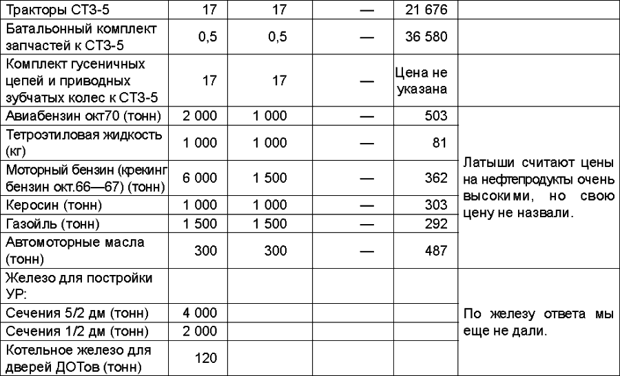 Кроме того, еще 11, 12 и 16 марта начальника снабжения латвийской армии полковник А. Далбергс направил во всесоюзное объединение «Техноэкспорт» письма с запросом на поставки ряда химических материалов (см. таблицу 30), а также 25 000 патронных гильз для 3,3-дюймовой скорострельной пушки. 20 марта «Техноэкспорт» переслал эти письма в Инженерный отдел НКВТ, указав, что поставкой этих материалов он не занимается[841]. Кроме того, 2 апреля А. Далбергс направил в Инженерный отдел НКВТ запрос № 234/Brt о возможности продажи 185 автомобильных шин 6,00х18 со специальным протектором для вездеходных автомобилей[842].