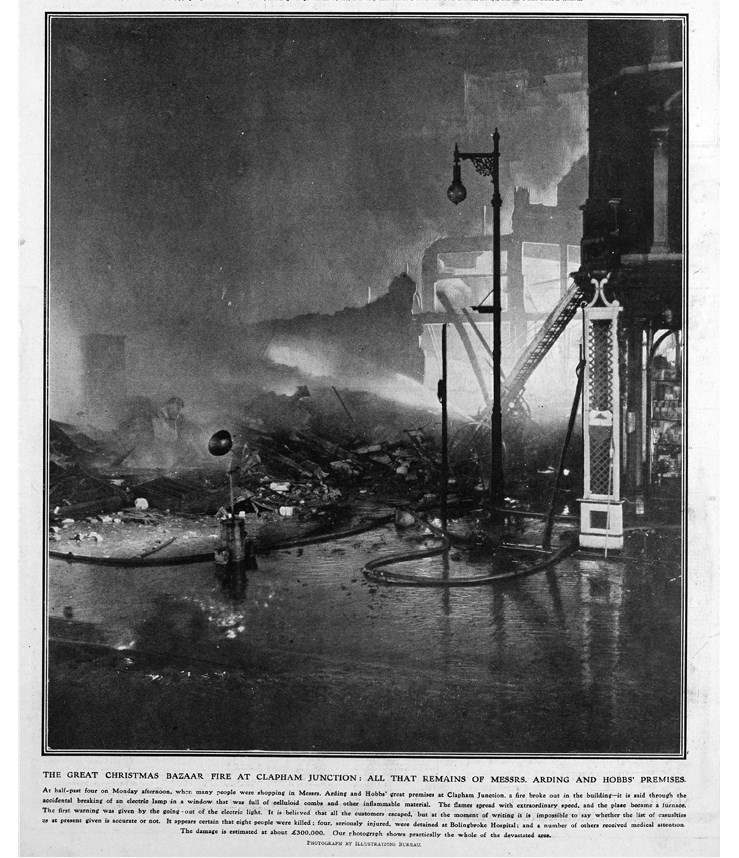 Парикмахерские, цирюльни и ювелирные магазины тоже представляли собой зону риска. В их новых широких стеклянных витринах, часть которых украшали зеркала, фокусировавшие солнечные лучи, были разложены гребни и расчески, и в летний зной они сами собой воспламенялись[559]. Пожары на предприятиях слишком многочисленны, чтобы перечислять их все, но за трагедией на фабрике Моррисона в Америке всего через месяц последовал крупнейший пожар в универмаге в Великобритании. Во время предрождественской гонки за покупками в Лондоне загорелся торговый дом Arding & Hobbs, предприятие, насчитывавшее пятьдесят отделов и шестьсот сотрудников (ил. 3). Продававшиеся в нем бесчисленные целлулоидные изделия испепелили его дотла, а также разрушили еще сорок магазинов и жилых домов по соседству. Возгорание произошло, когда продавец попытался достать гребень с украшенной к Рождеству витрины, заполненной целлулоидными изделиям и «снегом» из хлопковой ваты, и опрокинул зонтик на электрическую лампу. Лампа разбилась, произошло короткое замыкание, и витрина загорелась. Универмаг Arding & Hobbs «погрузился во тьму», женщины с детьми с криками выбегали из здания, и «через десять минут магазины раскалились как печь»[560]. Работники торговых залов героически выводили покупателей из горящего здания, и не всем сотрудникам удалось выжить. Девять человек погибли, как описывали очевидцы, в гигантском, «похожем на водопад Ниагара пламени». В их числе был повар, который, спасая жизни своих коллег-женщин, «потонул в огненном вихре». Несколько человек в панике выпрыгнули из окон мимо сеток, расставленных пожарными. Пламя бушевало настолько неистово, что чудовищно обгоревшее тело одного из сотрудников универмага опознали «лишь по обрывку рубашки и характерной запонке для воротника»[561].