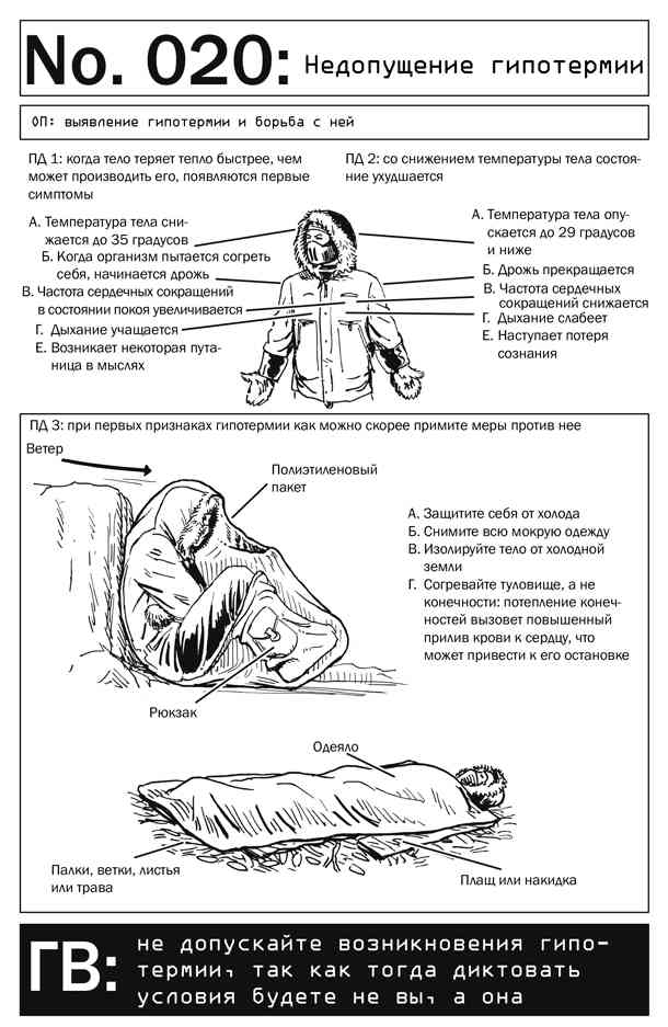Какой-то определенной внешней температуры, при которой обязательно наступает переохлаждение, не установлено. Все зависит от ветра, от изолирующих свойств одежды, уровня жидкости в организме, степени его физической подготовки, процентного содержания жира в нем и силе воздействия на него влаги. (Поскольку вода является отличным проводником тепла, влага на коже или даже возле нее будет отводить его от тела.)