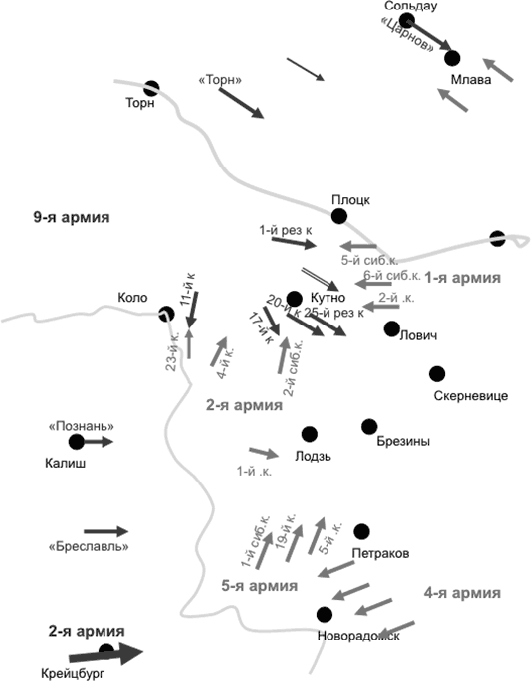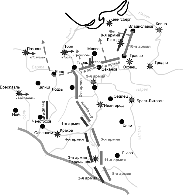 Десятая армия атакует 8-ю армию с фронта – на Кёнигсберг. Первая армия с фронта атакует корпус Цастрова на Сольдау (оба эти наступления были и в текущей реальности). Главный удар наносит 5-я армия между Цехановом и Граево. А 9-я армия отвлекает внимание противника, организуя опасный для обеих сторон удар в междуречье Вислы и Варты. Ее поддерживает 2-я армия. Четвертая армия представляет собой резерв фронта, его использование определяется действиями противника.