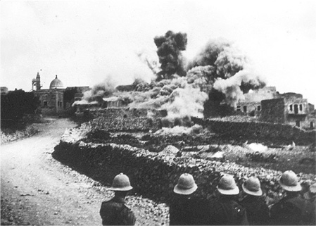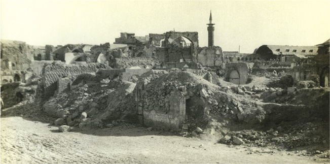 15. Дамаск в 1925 году, разрушенный в результате французских воздушных бомбардировок. В октябре 1925 года город восстал против французского колониального правления. Повстанцы захватили дворец Азма, построенный в XVIII веке, где размещалась резиденция французского верховного комиссара Мориса Саррайя. И хотя колониальная администрация давно покинула дворец, весь квартал подвергся 48-часовому артиллерийскому обстрелу со стороны французов. Как сообщал один из очевидцев, «мощные взрывы и пожары уничтожили больше 600 самых великолепных зданий» сирийской столицы. На переднем плане руины дворца Азма.