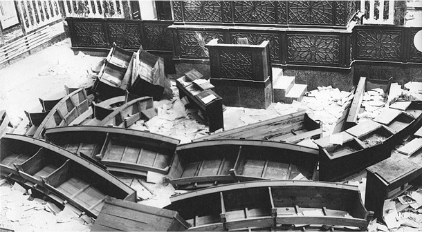 5. Сирийский парламент 29 мая 1945 года. Вопреки обещаниям правительство де Голля отказалось предоставить Сирии полную независимость и передать контроль над вооруженными силами страны правительству президента аль-Куатли. В ответ на всплеск антифранцузских выступлений, охвативших всю Сирию, в мае 1945 года французы штурмом взяли парламент и ключевые правительственные учреждения и подвергли жилые кварталы Дамаска интенсивной бомбардировке в тщетной попытке навязать свою волю мятежным сирийцам. Последние французские солдаты покинули Сирию в апреле 1946 года.